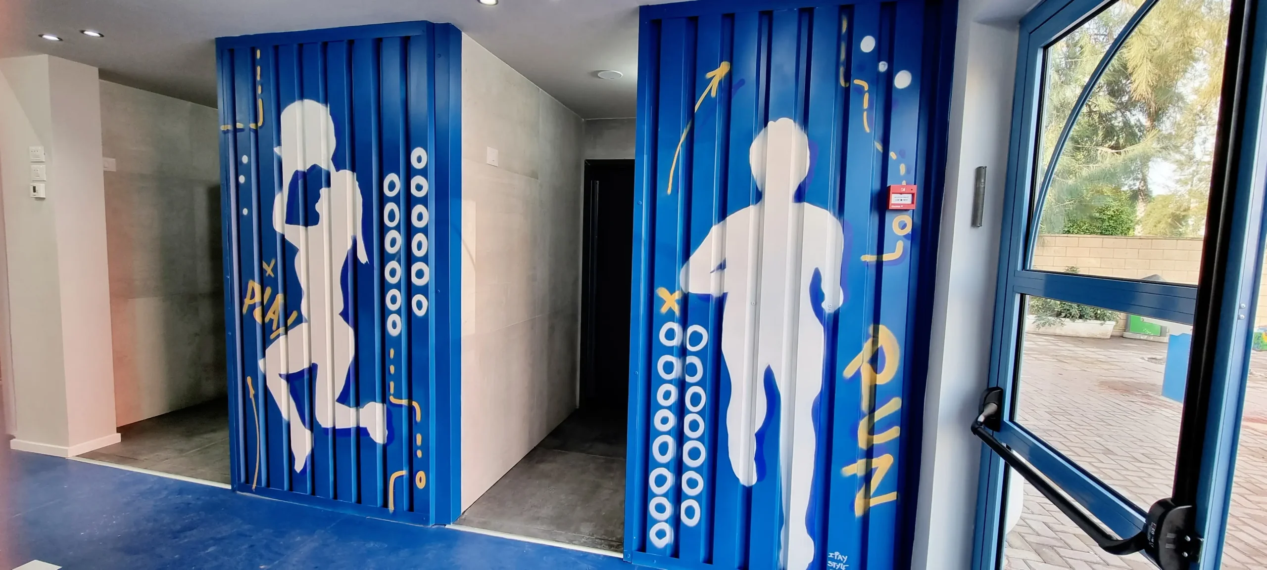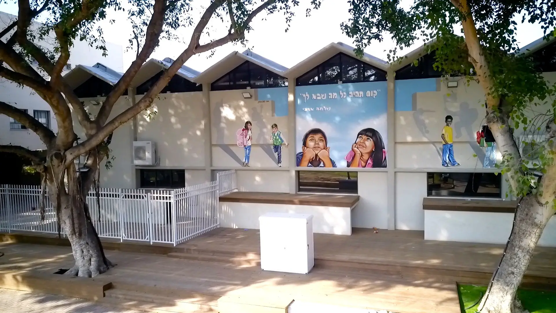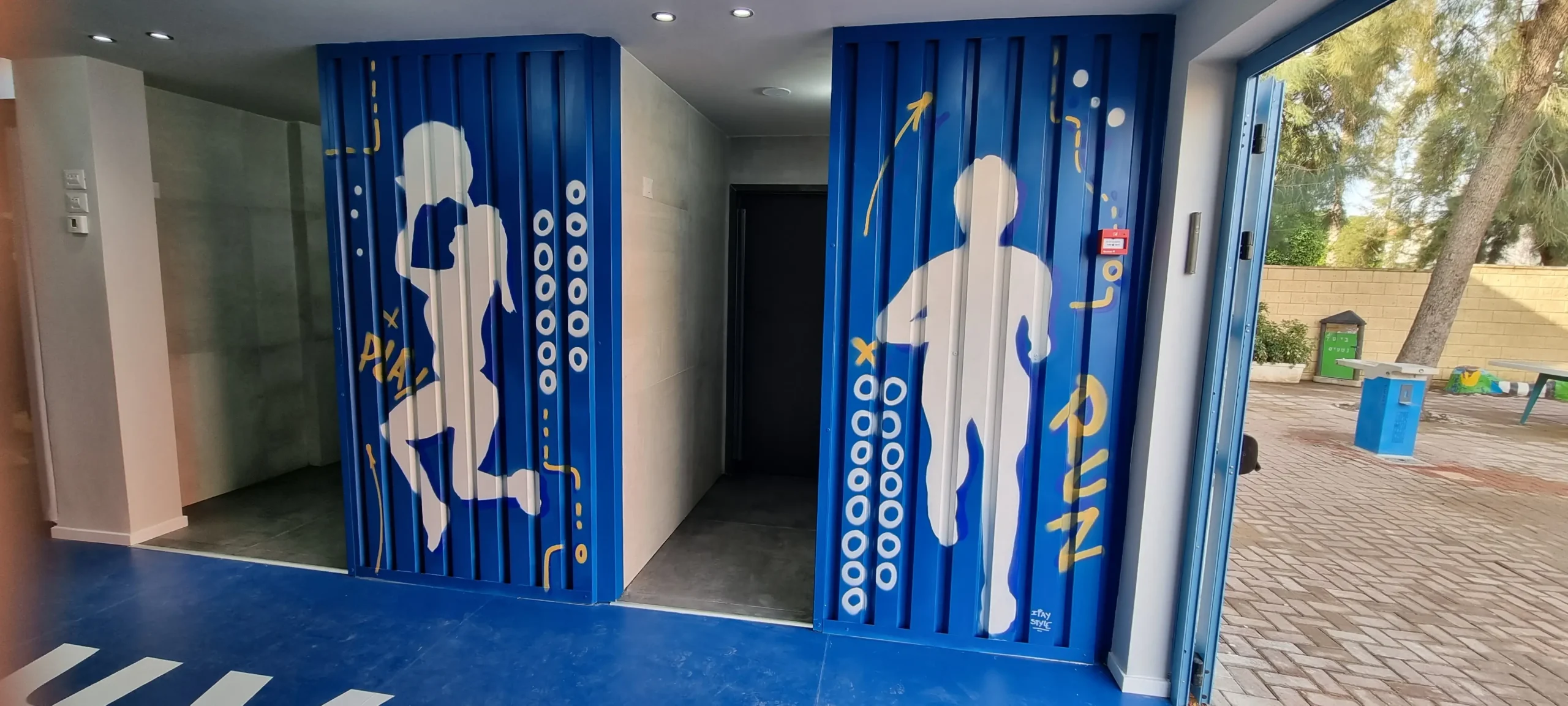 גולת הכותרת בפרויקט היא ציורי הקירות המרהיבים, המשלבים את צבעי האפור והכתום בתוך האולם ומחוצה לו. ציורי הקיר החיצוניים, הפונים לרחוב, הופכים את האולם לנקודת ציון אדריכלית מושכת עין, המזמינה את הקהל הרחב להיכנס ולחוות את המרחב. החיבור הוויזואלי בין הפנים לחוץ מחזק את זהות האולם ויוצר הרמוניה עיצובית כוללת.